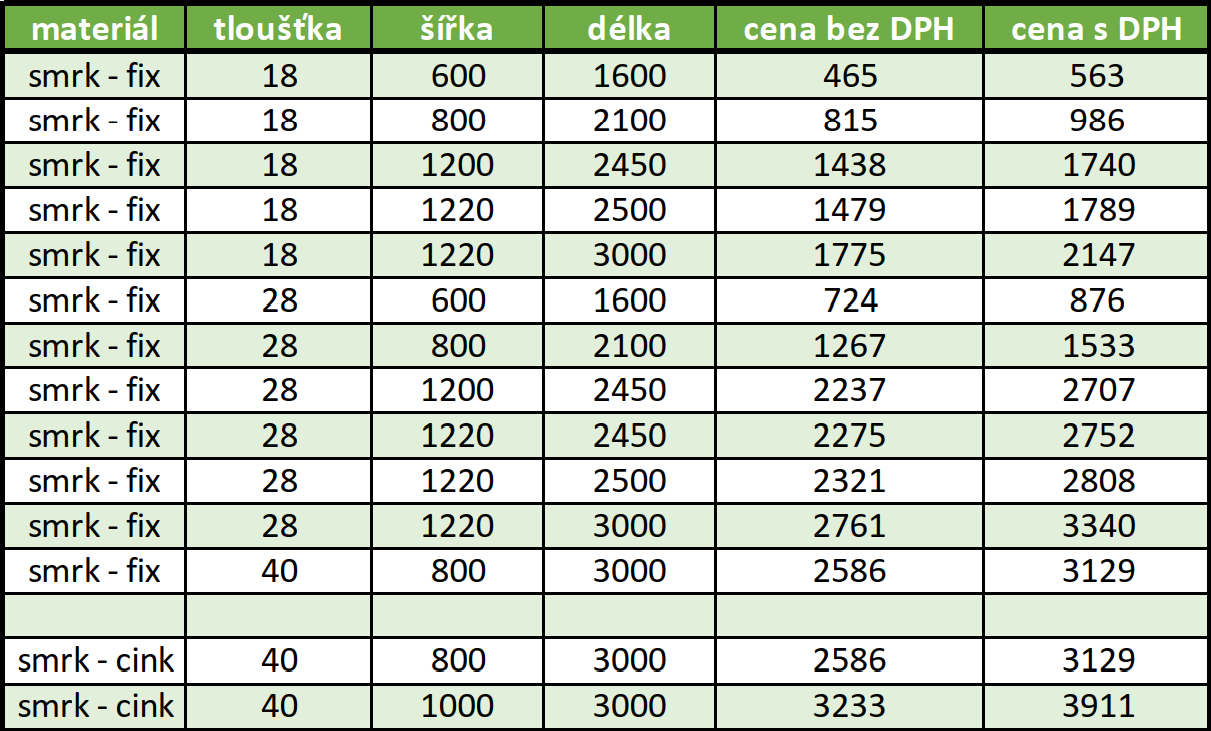 Spárovky SMRK – Ceník Prodáváme smrkové spárovky průběžné (fix) a délkově napojované (cink). Požadovaný sortiment spárovek může být dočasně vyprodán, proto si, prosím, stav zásob ověřte přímo ve skladu na Chyňavě. Zdeněk Smolík +420 608 238 045 Spárovky včetně dopravy (společností TOPTRANS) můžete objednat na emailu: sparovky.objednat@email.cz POLEDNÍ PAUZA: od 11:30 hod do 12:30 hod Smrk ceník